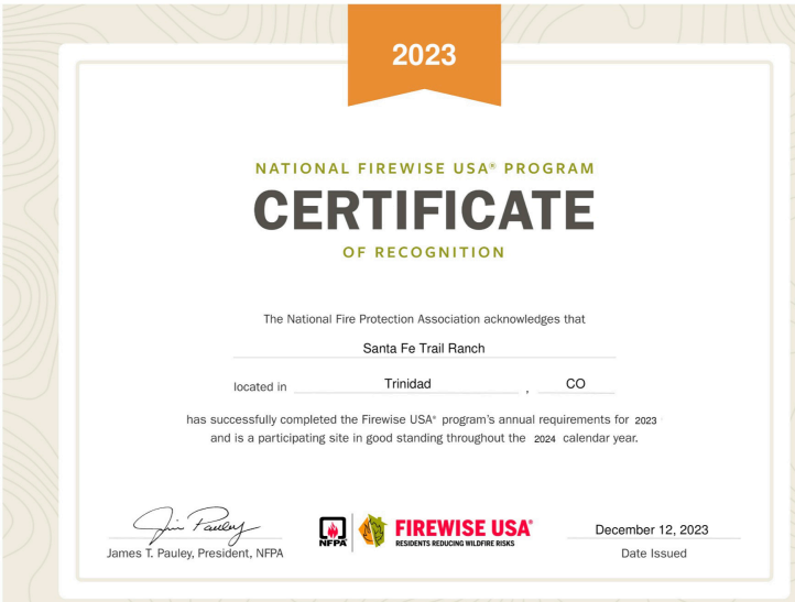 Santa Fe Trail Ranch became a FIREWISE-certified community in 2006, and has renewed our certification every year since.